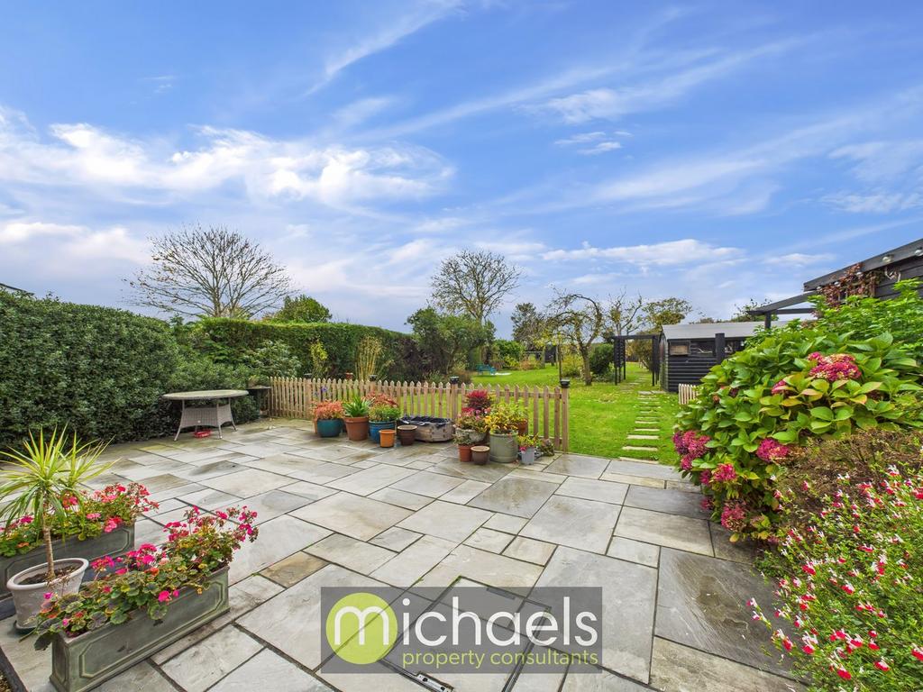Outside, the property truly excels. The expansive, south-facing rear garden is beautifully maintained and includes three useful outbuildings, a spacious patio area perfect for outdoor dining, and plenty of lawn space bordered by mature planting. To the front, a large driveway and car port provide ample off-road parking.