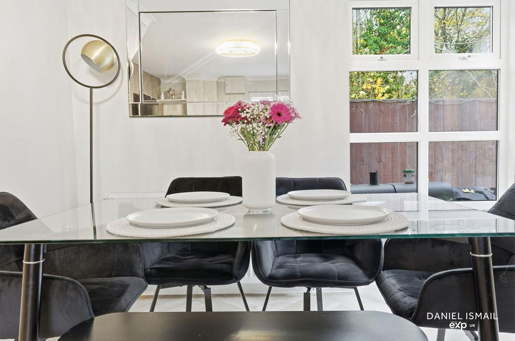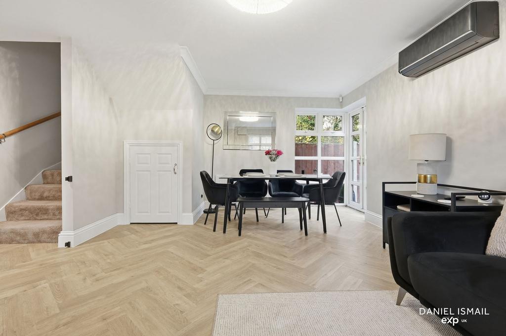 Upon entering the home, you are greeted by a bright and contemporary entrance hallway, setting the tone for the rest of the property. To the left, there is a convenient downstairs WC. At the end of the hallway, the space opens up to reveal a beautifully presented and spacious living room. This bright and airy room easily accommodates both a comfortable seating area and a family-sized dining table, making it perfect for both everyday living and entertaining guests. The living room enjoys direct access to the west-facing rear garden, which benefits from a private, non-overlooked aspect—an ideal space for outdoor dining and relaxation.