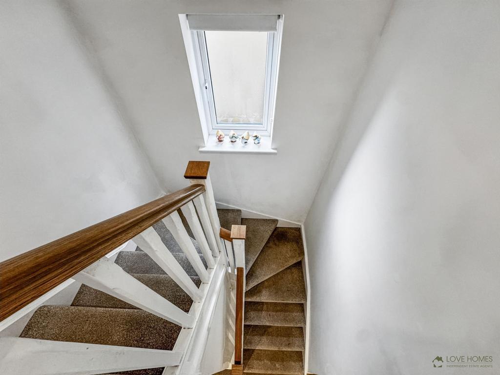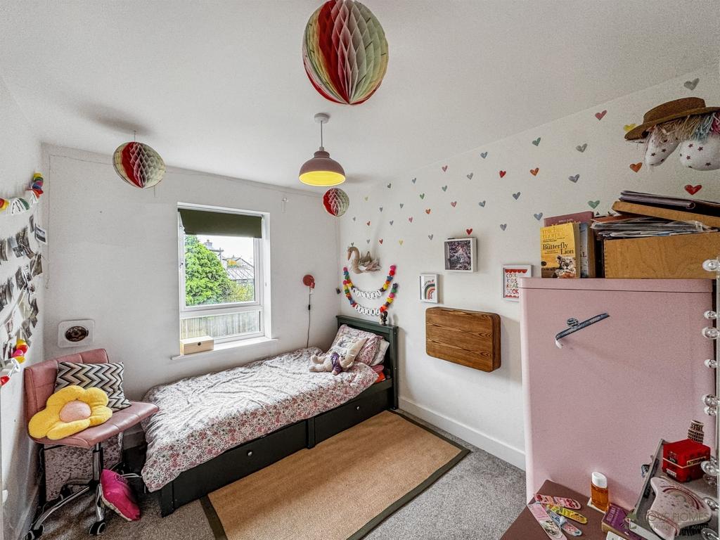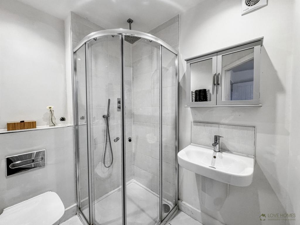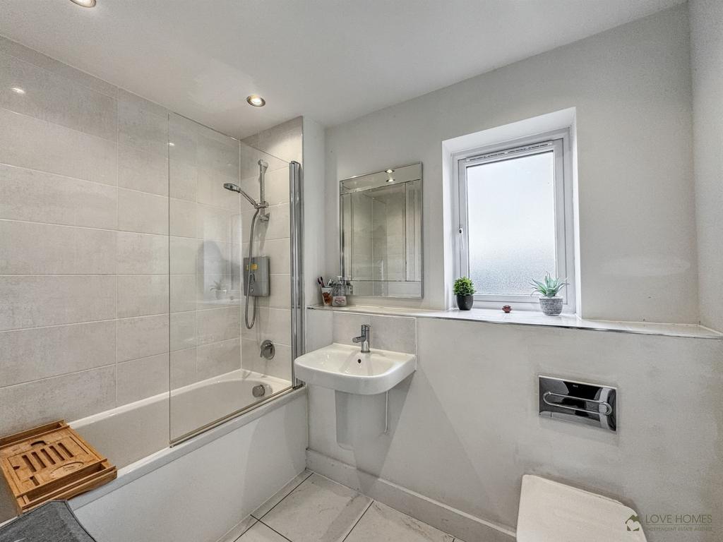 Upstairs, there are three well-proportioned bedrooms. The primary bedroom benefits from its own en suite, complete with a low-threshold double shower, wash basin, and WC. The second and third bedrooms are both generous doubles, each filled with natural light and offering flexibility for family use, guests, or a home office. The family bathroom features a three-piece suite with a bath and overhead shower, WC, and wash basin, complemented by a frosted window that brightens the space.