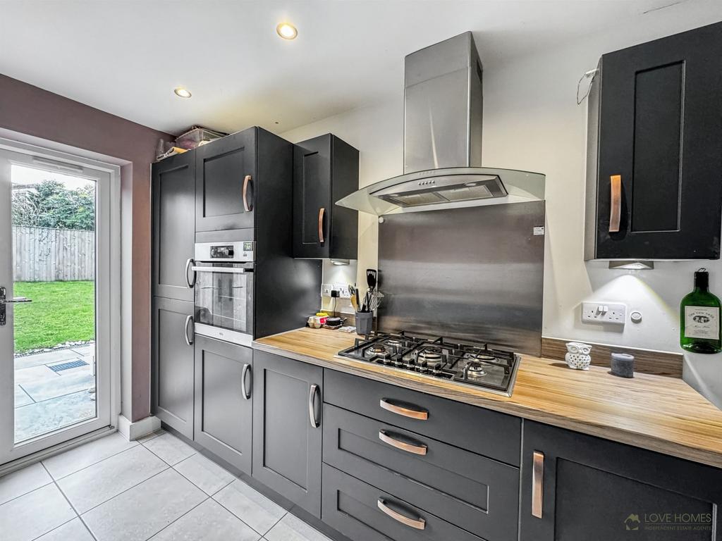The open-plan dining kitchen runs from the front to the back of the home, making it the heart of the property and perfect for entertaining. Finished in a stylish navy blue with wood-effect worktops, the kitchen includes a range of integrated appliances: a high-level oven, five-ring gas hob with extractor, fridge freezer, and dishwasher. Its galley-style layout offers plenty of preparation space for family cooking, while the dining area comfortably accommodates a large table and chairs. Full-length windows to the front flood the room with light, and a glazed door to the rear leads directly to the garden, ideal for summer gatherings.