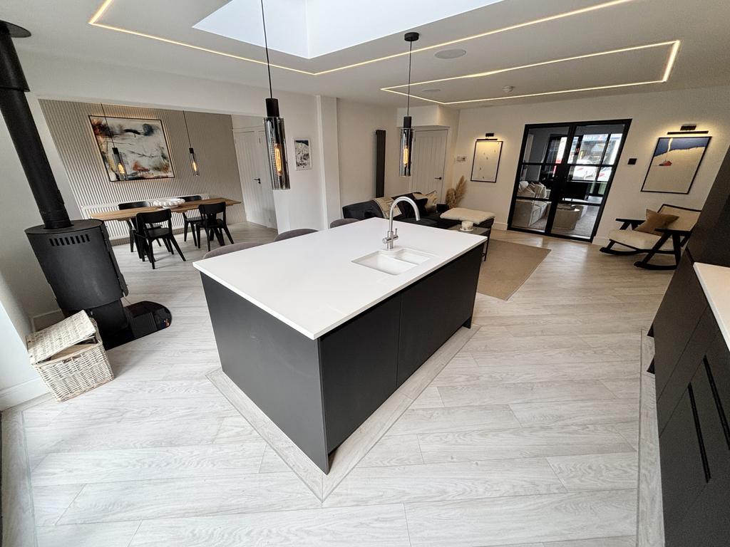 Bifolding doors to the rear aspect, sky lantern, Modern fitted kitchen with a range of wall and base units with complimentary work surfaces, a range of integrated appliances including; double oven, hob, fridge/freezer, dishwasher, sink unit with mixer tap and boiler hot tap, under the stairs storage cupboard, tv point, two radiator, modern fitted log burner and open aspect into...