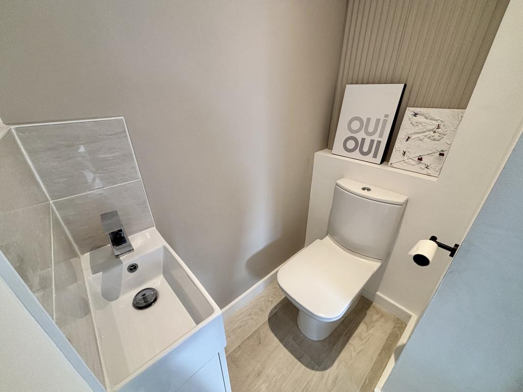 Modern fitted two piece suite comprising; low flush wc, wash hand basin and radiator.