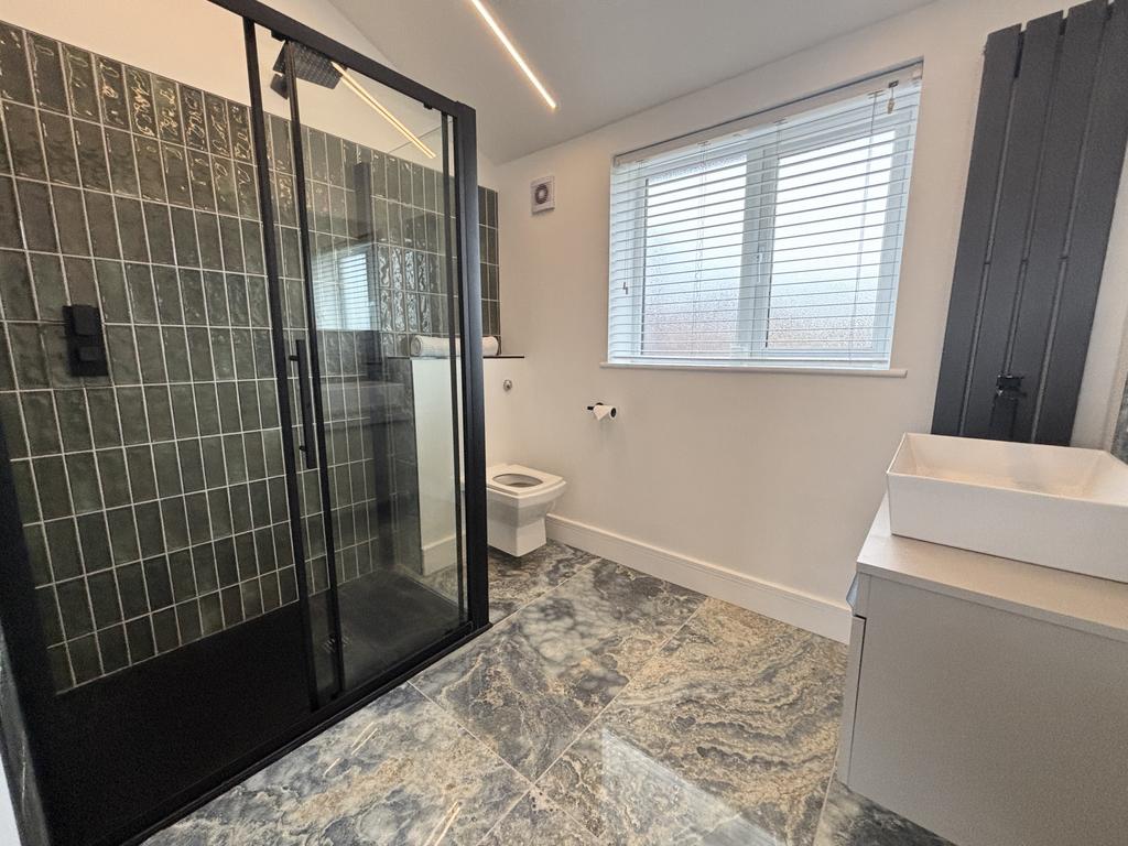 UPVC double glazed window to the rear aspect. Modern fitted three piece suite comprising; large shower with glass screen, wash hand basin, low flush wc and radiator.