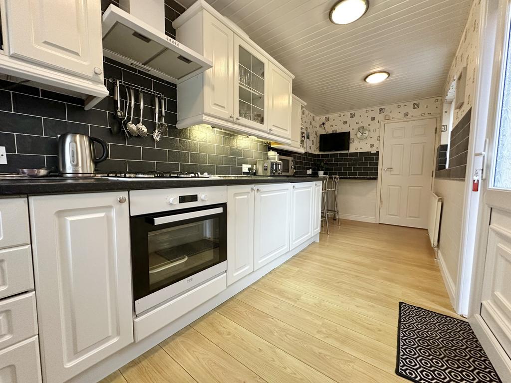 UPVC double glazed windows and door to the side aspect, range of wall and base units with complimentary work surfaces, stainless steel sink unit with drainer and mixer tap, integrated oven with four ring gas hob, extractor over, plumbed for washing machine, breakfast bar area, TV point, laminate flooring and radiator.
