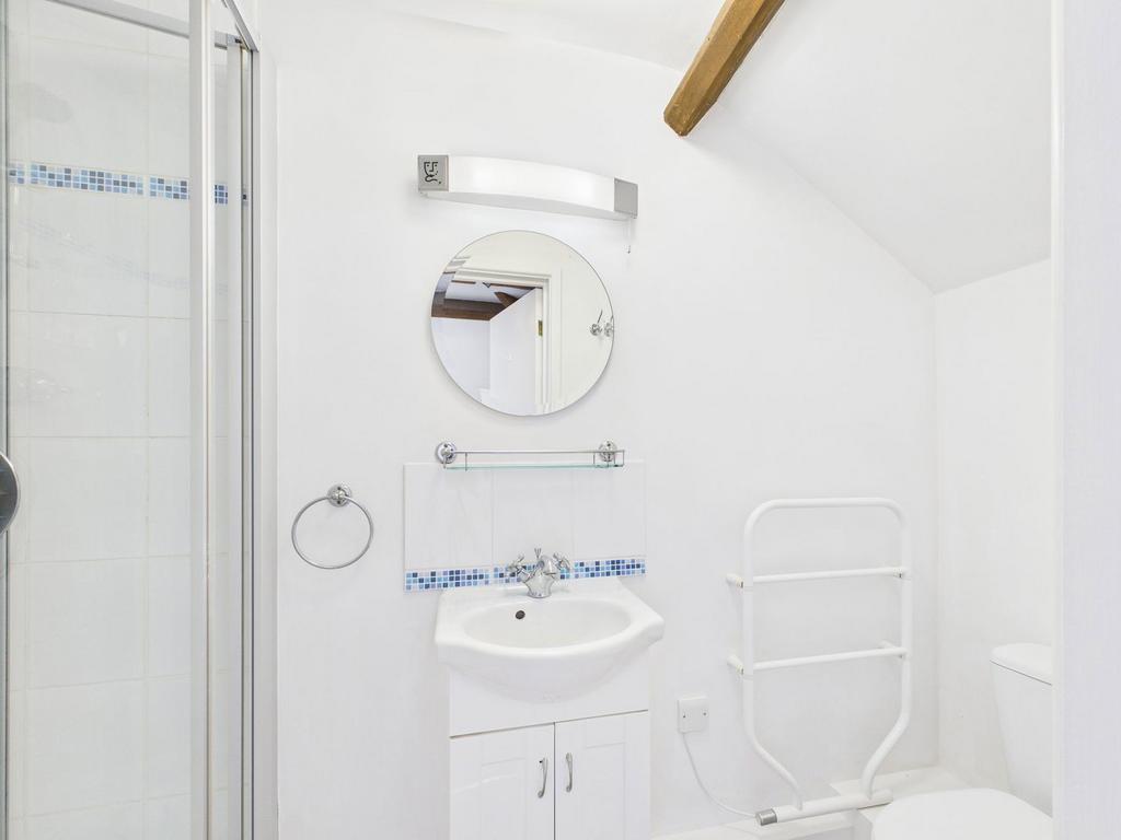 Comprising of three piece white suite, corner shower cubicle, vanity wash basin and WC. Exposed beams, heated towel rail, electric light and shaver point.