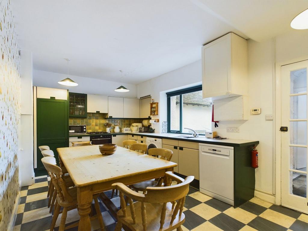 A large family sized room, with ample wall and base units with laminate work tops. A large window with stainless steel sink unit beneath. Stove four ring gas hob with oven and grill below and an extractor fan over. There is an integral fridge freezer and a washing machine and dishwasher. Wall mounted Vaillant boiler, radiator and under stairs storage cupboard.