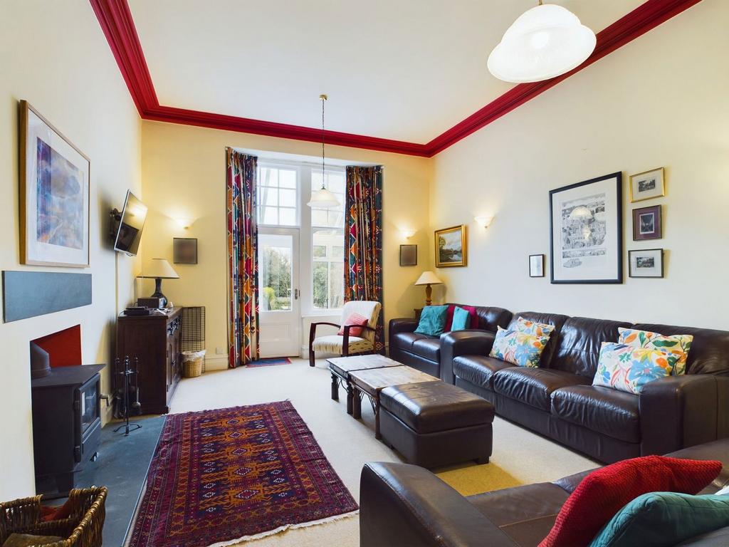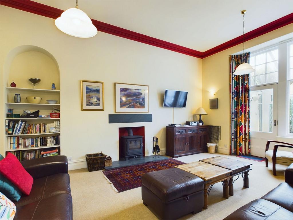 An excellent room with high ceilings, coving and an alcove with built in shelves. There is a wood burning stove sat on a slate hearth and two radiators. There is a window and a door at the side which lead out to the conservatory.