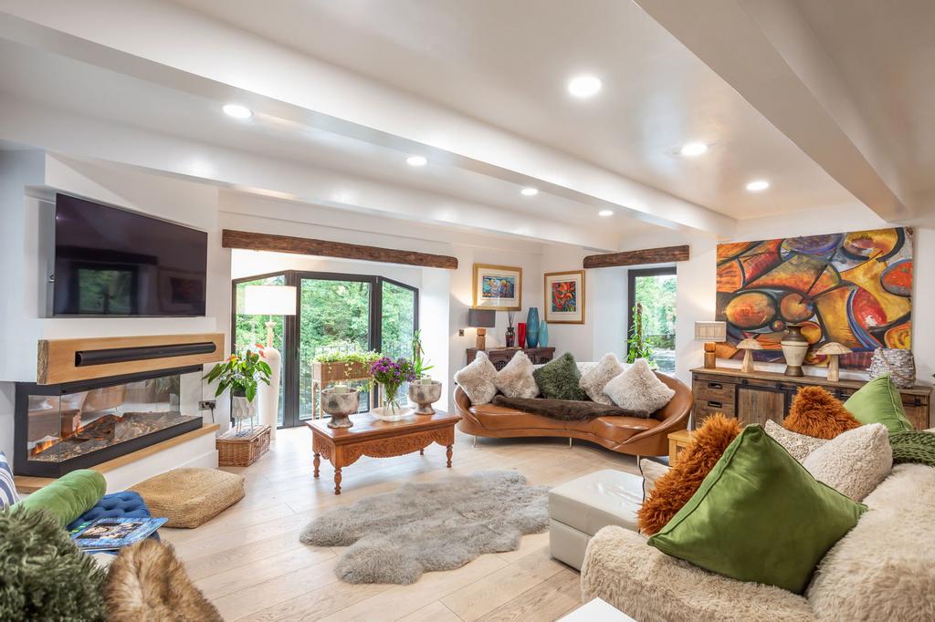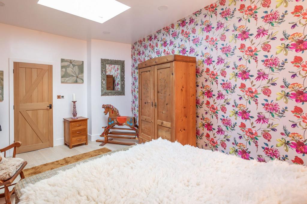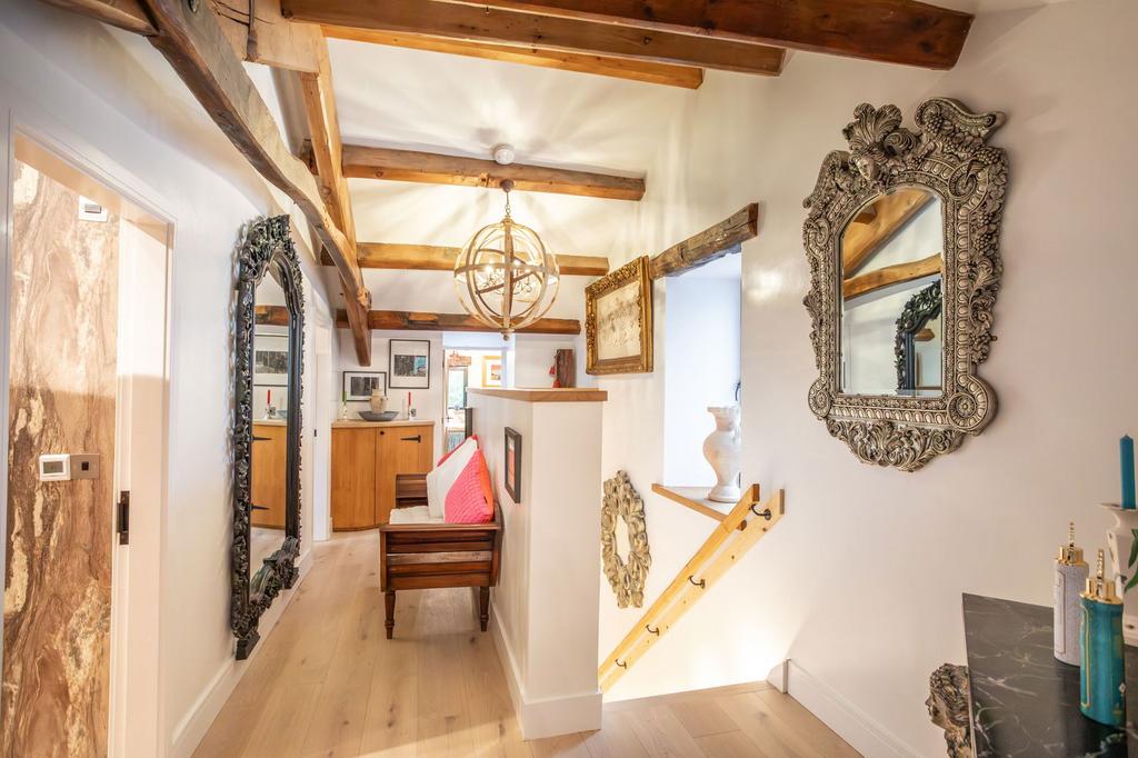Accessed via a striking, timber-clad contemporary extension, the accommodation unfolds into a glamorous, well-appointed breakfast kitchen with bi-folding doors connecting to the large deck. A spacious sitting room flows seamlessly through a pointed archway into an atmospheric dining room. Also on the ground floor is a versatile fourth bedroom, currently used as a guest room but ideal as a home office along with a chic shower room.