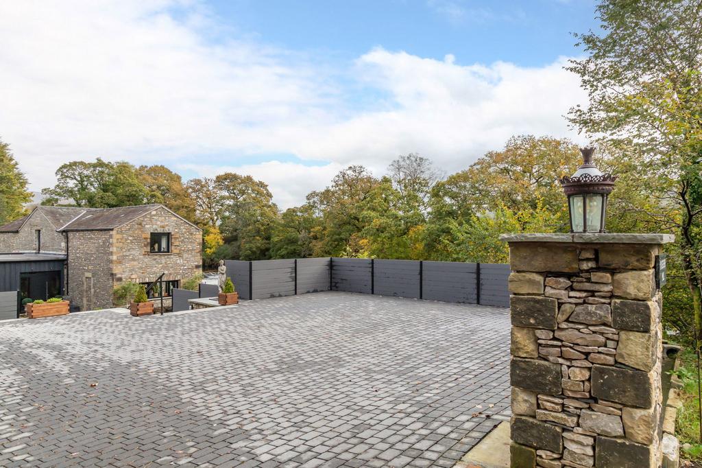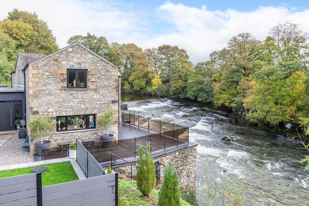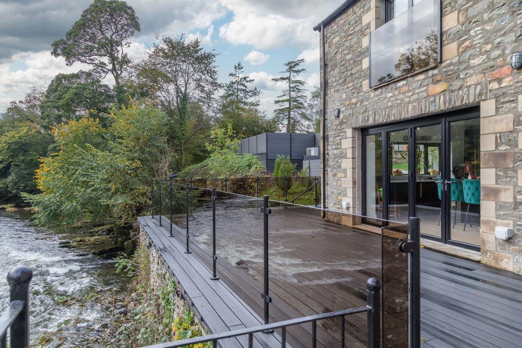 Substantial stone pillars topped with reclaimed former gas powered Victorian pub lanterns mark the entrance to the property. The impressive mill is in front of you, the River Lune providing the unique backdrop. A large paved parking area has plenty of room for parking and turning and from here a wide flagged path and two short flights of steps lead down to the front door, bypassing lawns on the way.