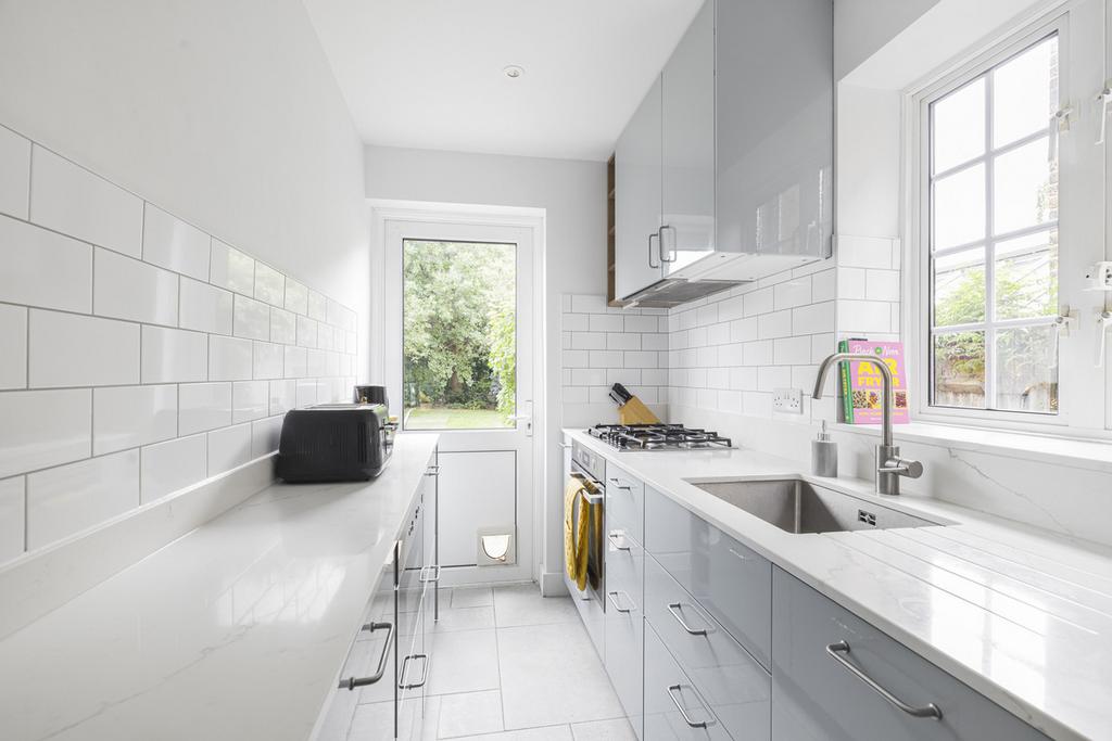 The bright through lounge/dining room is perfect for family time and entertaining, leading to a large rear garden featuring a paved patio, lawn, flower beds, and a shaded area ideal for a garden office or play space. The modern galley kitchen boasts ample cupboard space and as mentioned all appliances, while the family bathroom is conveniently located on the first floor.