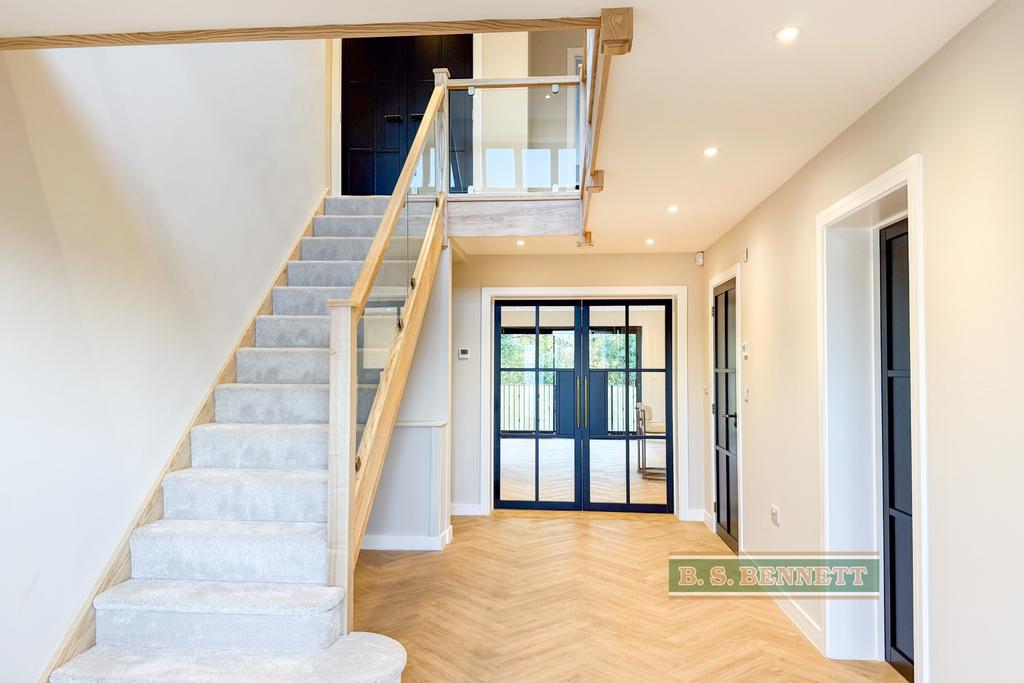 Underfloor heating to the ground floor Impressive entrance hall Staircase with glass balustrade Contemporary dark wood internal doors Aluminium double-glazed windows and doors Eco-friendly heating system with an electric air source heat pump Fully tiled bathrooms and cloakroom Karndean flooring to the ground floor Carpeting to all bedrooms and landing Large loft space