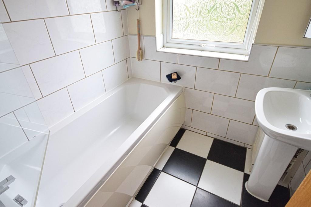 5' 10" x 5' 6" (1.8m x 1.68m)being part tiled and incorporating panelled bath having electric shower unit over, pedestal wash hand basin, heated towel rail and obscure double glazed window.