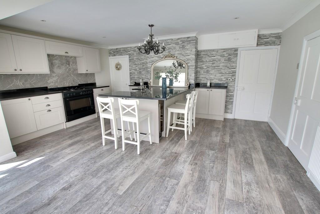 Fitted with wall and base units with granite worktops and central island with breakfast bar, range style cooker, integral dishwasher and wine fridge, butler sink with mixer tap, radiator, open plan, open plan to: