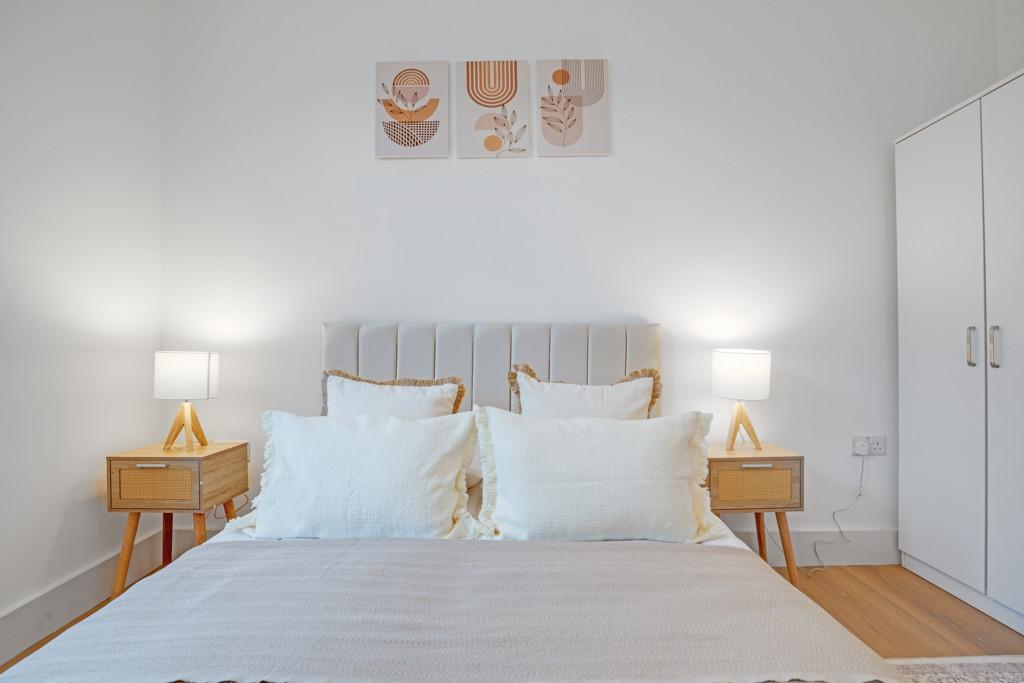 Some features include huge period windows, high ceilings, brand new art and furniture, outdoor leisure facilities including basketball court, gym area, communal roof terrace, bedrooms include large beds and plenty of wardrobes and storage space, luxury large tiled bathrooms with shower, bath, additional hand shower and sleek designer tiles. Very spacious master bedroom with armchair.