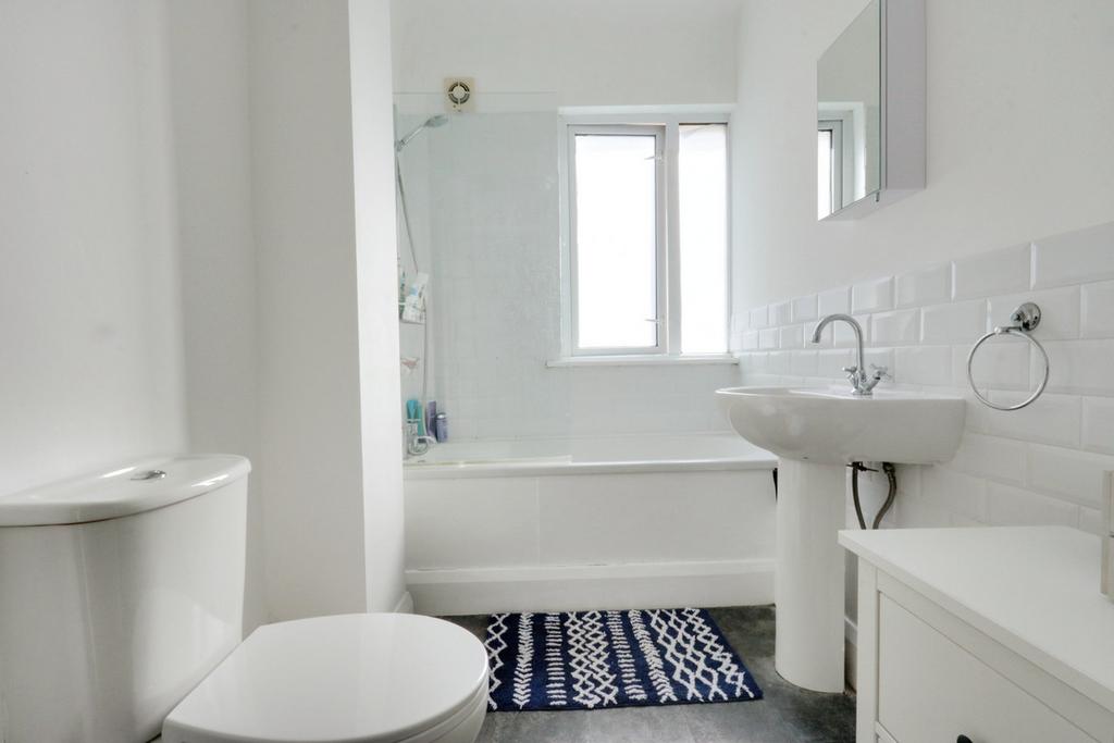 Three piece suite comprising bath with shower attachment over, pedestal wash hand basin, low level w/c, double glazed window to rear, smooth ceiling with pendant lighting, extractor fan, partially tiled walls, lino