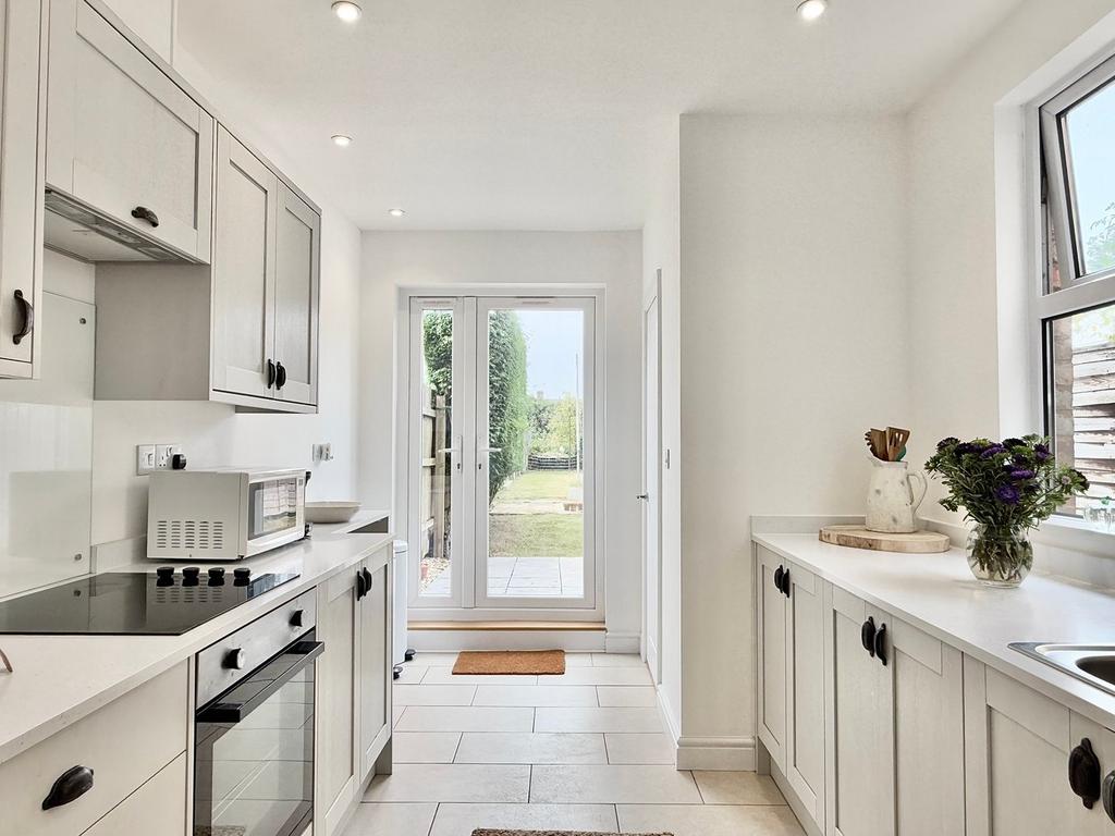 4.42m x 2.56m (14' 6" x 8' 5") Two double glazed window to side, Double glazed French doors to rear, Tiled flooring, Wall and base fitted units with cupboards and drawers, Laminate worktops, Plumbing for a washing machine, Space for a fridge freezer, built in oven, electric hob and cooker hood, One and half stainless steel sink and drainer unit with mixer tap, Spot lights.
