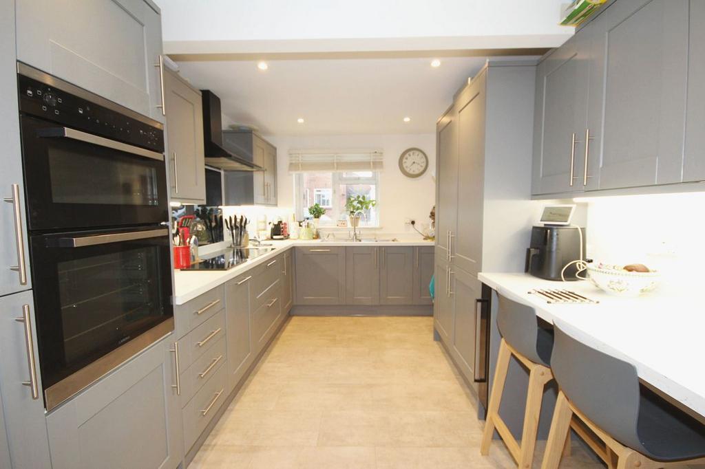 Kitchen 14'9 x 8'10 (4.54m x 2.44m): Window to front elevation, ample wall and base level units with worktops over, eye level double oven, hob with extractor over, breakfast bar, integrated appliances.