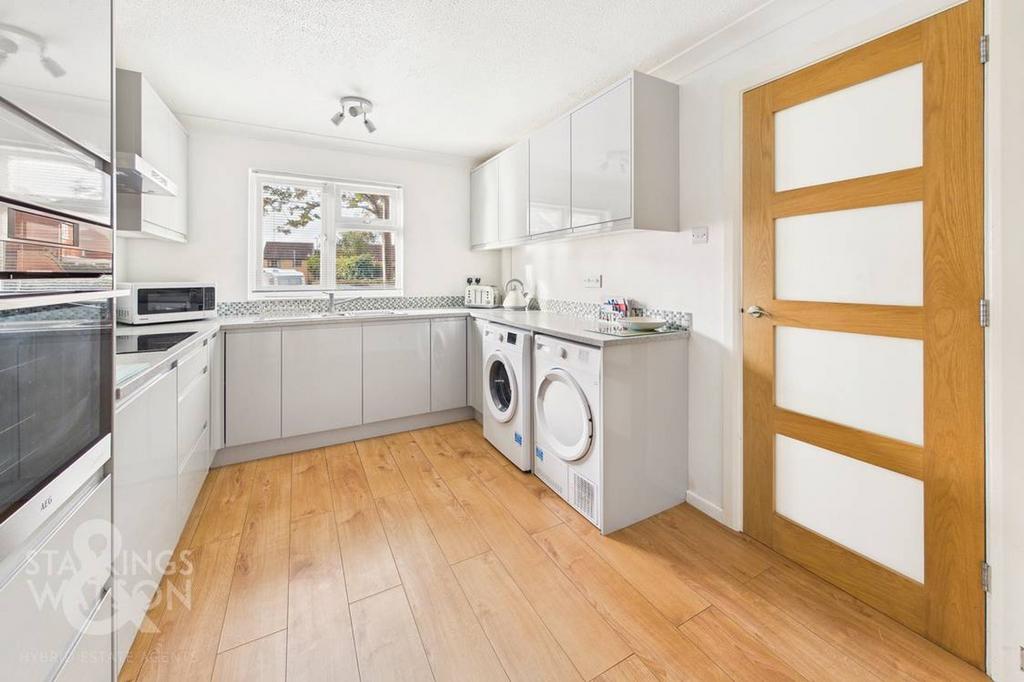 Stepping inside, the entrance porch offers plenty of storage space for outdoor wear, opening to the welcoming entry hall. Offering hard flooring underfoot for ease of maintenance with a conveniently located W.C to left hand side, including a wall mounted heated towel rail. Adjacent, integrated storage can be found and stairs rise to the first floor with continued storage beneath. Opening from the right, the refitted kitchen offers a range of wall and base storage cupboards in addition to integrated appliances including an oven, inset induction glass hob and extractor above whilst under counter space is available for a washing machine and a tumble dryer. Flowing to the rear of the home, the 19’ open plan sitting and dining room offers a spacious feel with plenty of room for formal dining and soft furnishings whilst uPVC double glazed windows and French doors ensure the room is well lit.