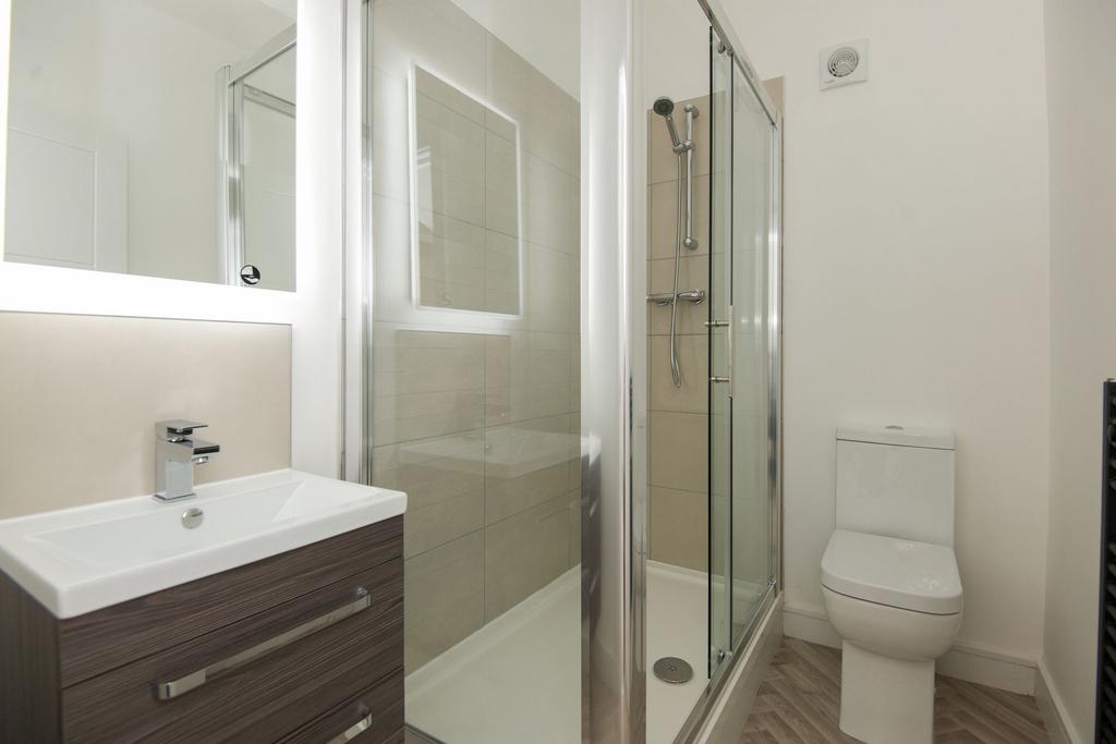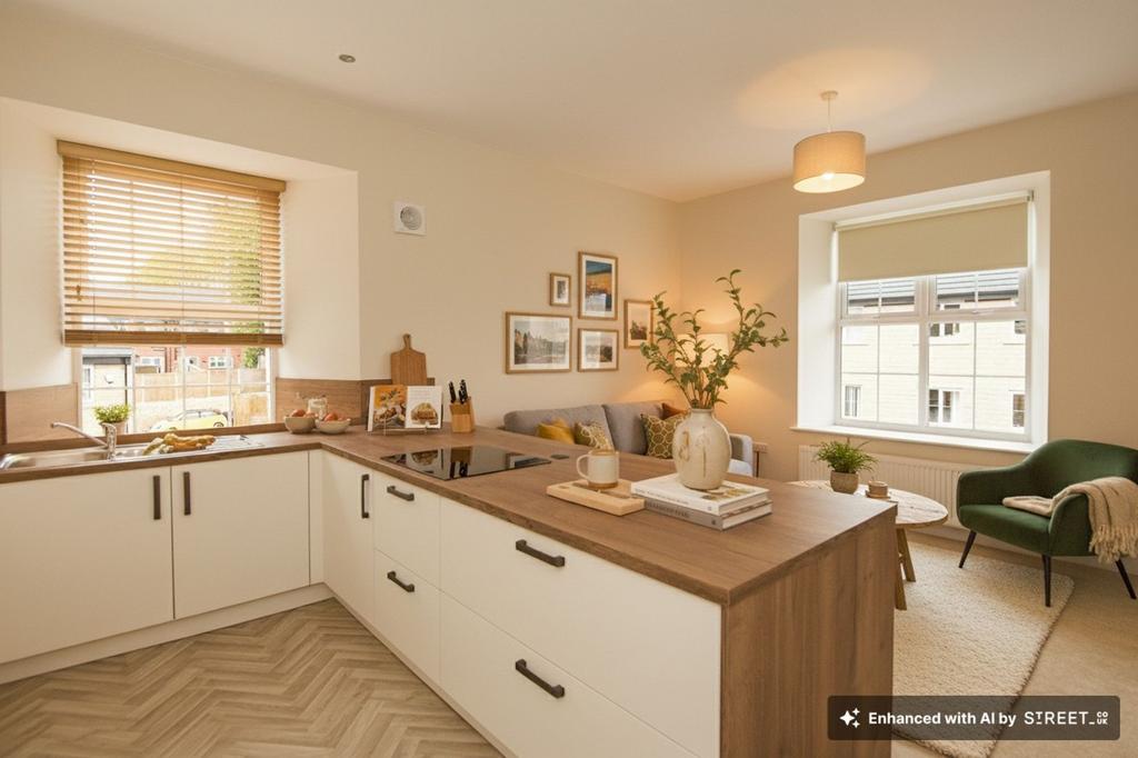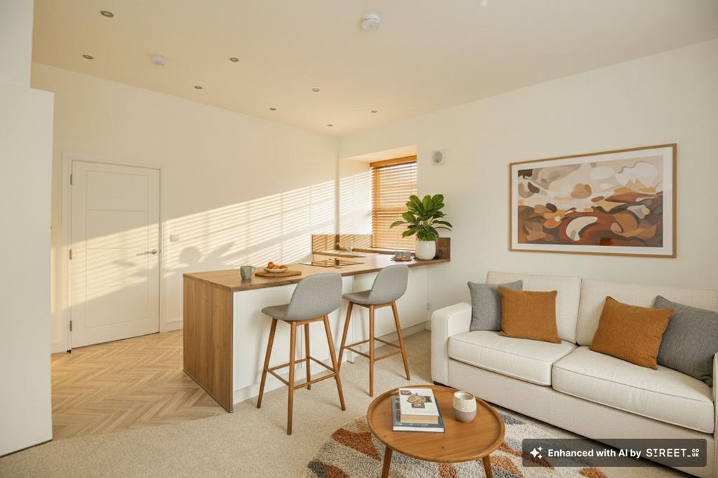 The superb open-plan living area provides plenty of room to relax and entertain, with space for both seating and dining, while the modern fitted kitchen is finished with sleek cabinetry and integrated appliances. Two well-proportioned bedrooms offer flexibility for guests or home working, and the stylish shower room is designed with a clean, modern aesthetic.