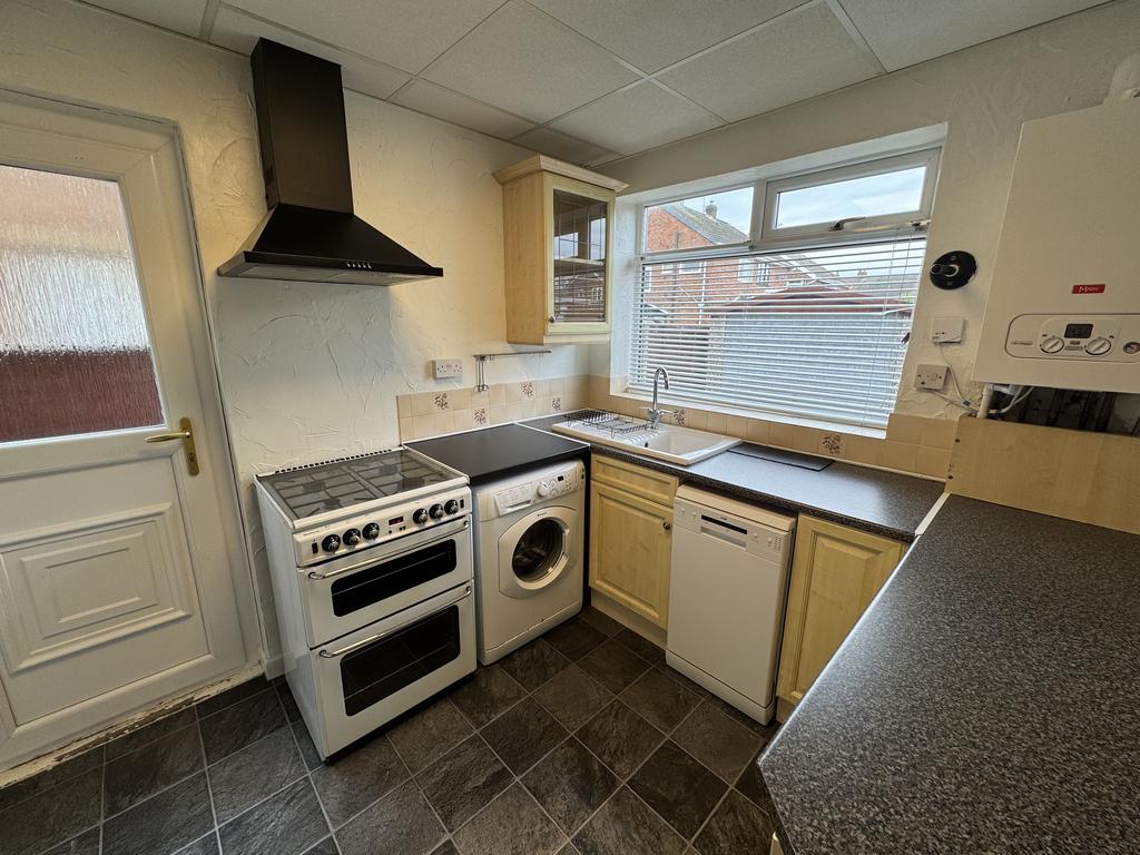 Dining Kitchen. 4.74m x 3.42m, UPVC Double glazed window and door, range of wall and base units, oven and hob, sink unit, dishwasher, washing machine.