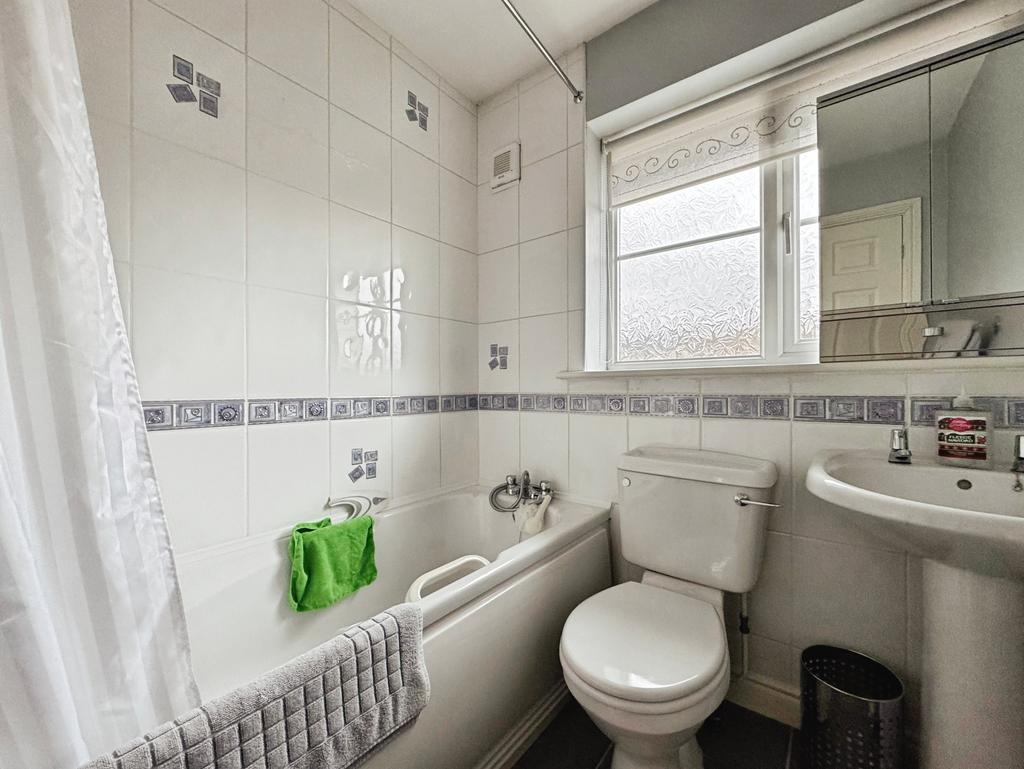 Featuring a bath with overhead shower, WC and wash basin. Window to the rear and radiator.
