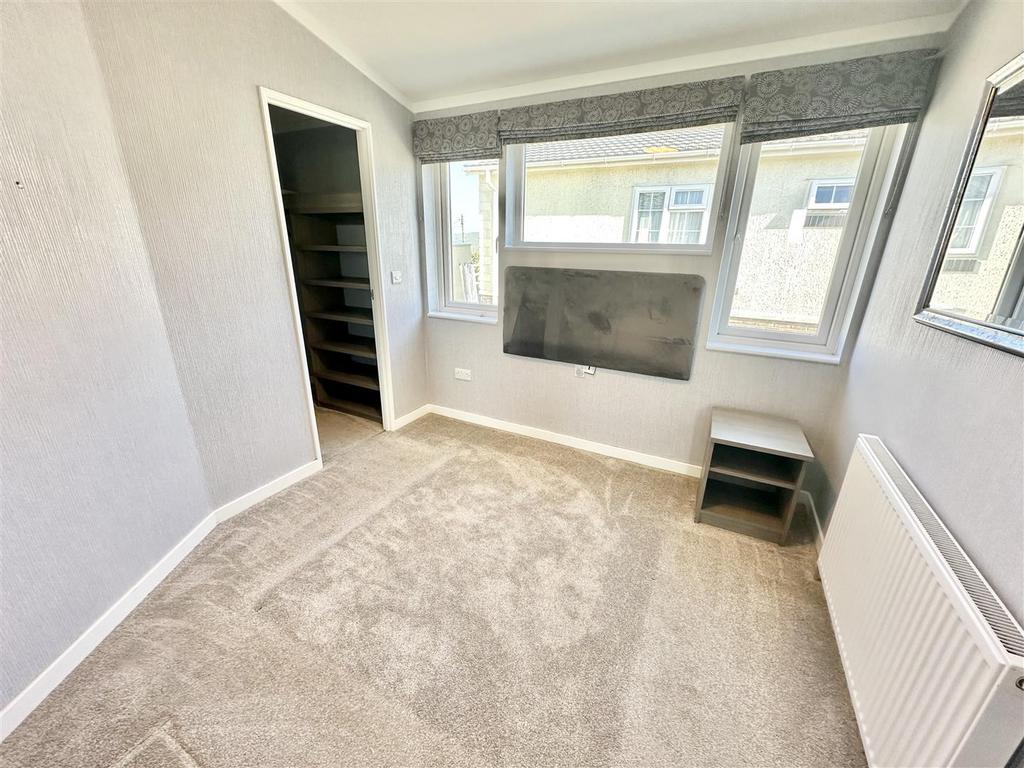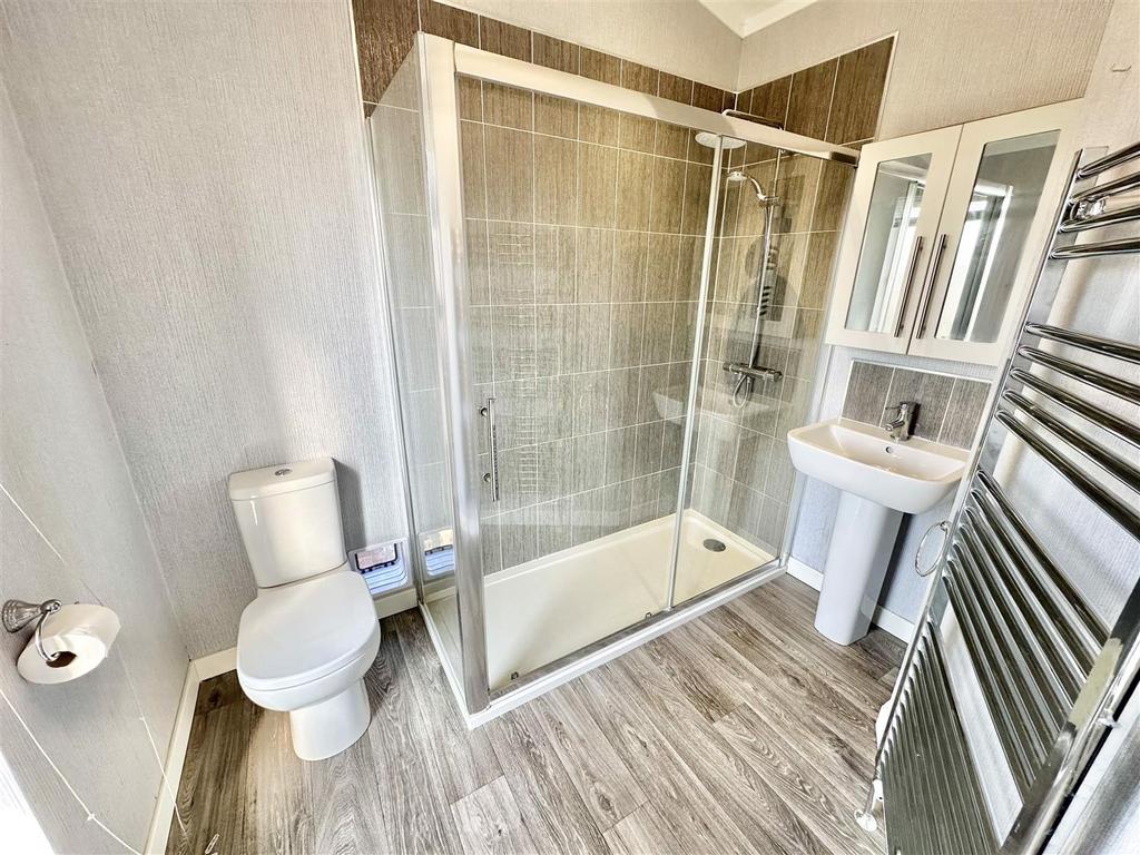 The heart of this fabulous park home is the open plan living / dining kitchen room. This is a wonderful room filled with an abundance of natural light from dual aspect full length windows and double opening French doors. The doors lead out onto a composite decking area with a glass balustrade with wonderful views over the surrounding area. The kitchen area features a range of modern shaker style eye level and base units, further enhanced with integral appliances including a fridge freezer, electric hob, electric oven, concealed extractor fan, slimline dishwasher and washing machine.