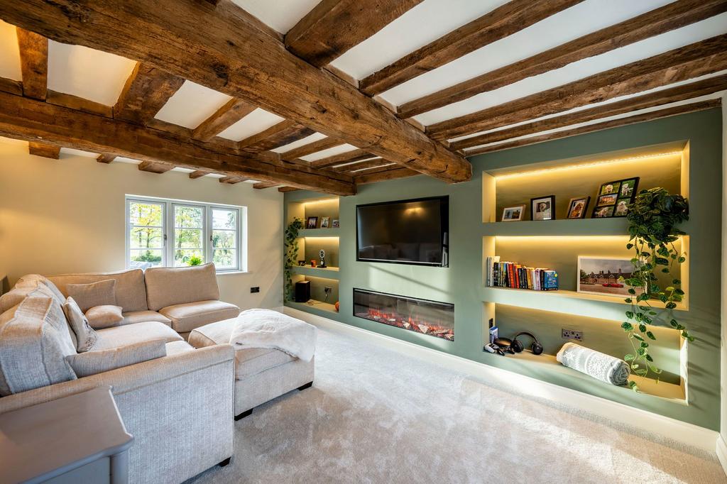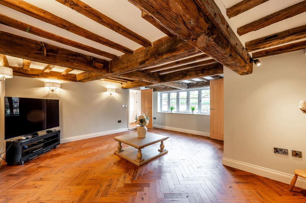 To the front of the house are three, beautiful reception rooms, designed around the original beams to create an almost, boutique Cotswold cottage vibe and the family room has been fitted with a stylish media wall.