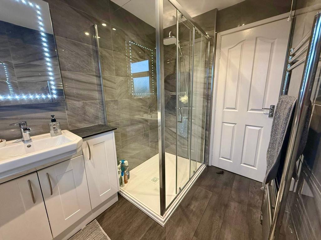 On the first floor, the property offers three bedrooms — two comfortable double rooms and a single — all neutrally decorated and offering flexibility for use as bedrooms, guest rooms, or home office space. The shower room is also located on this floor and is fitted with a modern suite, providing a clean and practical finish.