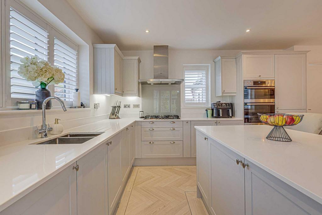 The ground floor is centred around a stunning open-plan kitchen, dining and family area, featuring integrated appliances, ample storage and a stylish breakfast bar island. Expansive windows fill the space with natural light, creating a bright and welcoming atmosphere. A separate utility room offers direct access to the garden, while the spacious dual-aspect lounge, extending from the front to the rear of the home, provides an ideal space for relaxation. The ground floor also includes an inviting entrance hall, a versatile study perfect for home working, a convenient downstairs WC and additional built-in storage.