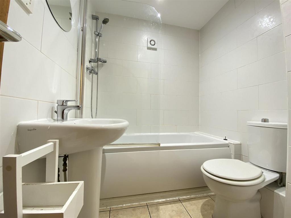 Bathroom - 2.328 x 1.857 (7'7" x 6'1") - Furnished with a three piece suite comprising: Panlelled bath with a wall mounted mixer shower over and shower screen, pedestal wash hand basin and a low level WC. Fully tiled walls, Tiled flooring, chrome heated towel rail, extractor fan.