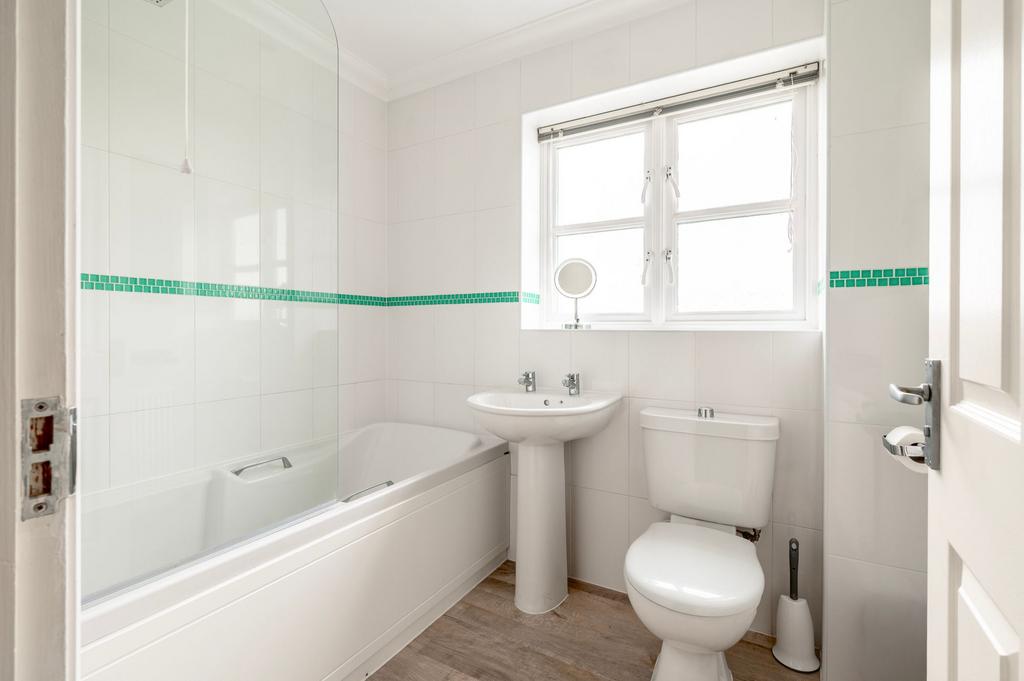 The remaining bedrooms are equally well-proportioned and filled with natural light, while the modern family bathroom is finished in a neutral palette with quality fittings, featuring a bath with overhead shower, pedestal basin, WC, and wood-effect flooring.