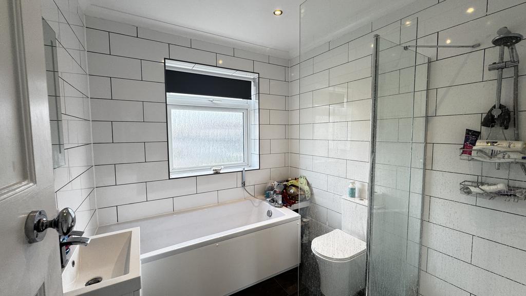 Fitted with a modern white bathroom suite comprising, panelled bath with mixer tap and hand shower attachment, separate walk ins shower enclosure with thermostatic shower mixer, low level WC, wash basin with cupboard under and illuminated mirror over, fully tiled walls, inset ceiling downlights, window to the rear.