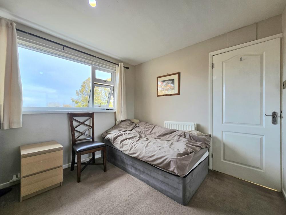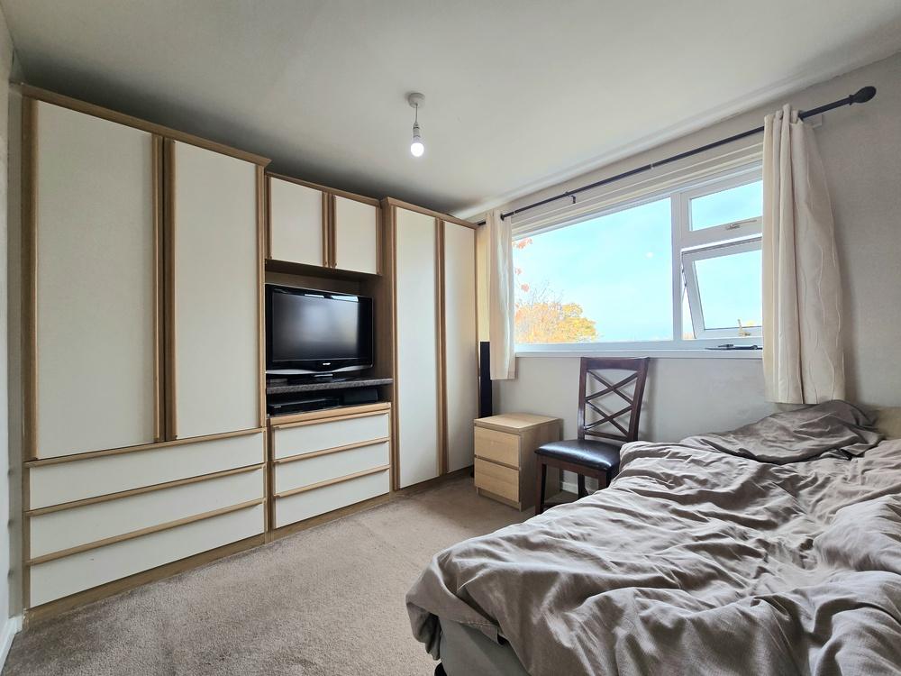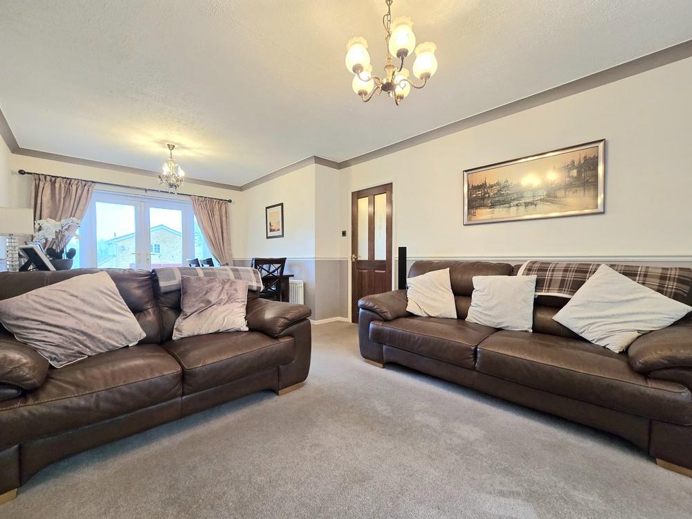 Approached via a quiet walkway, the entrance hallway leads into a bright and spacious living/dining room, featuring French doors that open out to the rear garden and allow natural light to flow through the space. The kitchen offers practical storage and has a side door providing easy access to the driveway and garage. Additional built-in cupboards in the hallway add to the overall convenience and functionality of the ground floor.