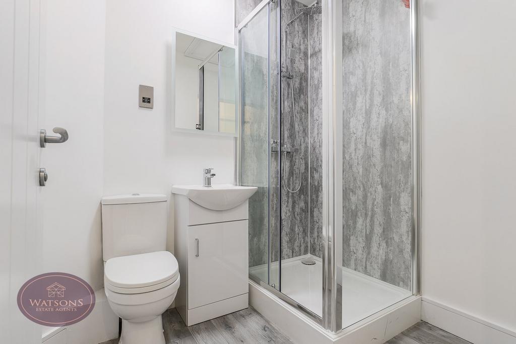 2.00m x 1.70m (6' 7" x 5' 7") White three piece suit comprising wc, vanity sink with storage under and mains fed cubicle shower, chrome heated towel rail and vinyl flooring.