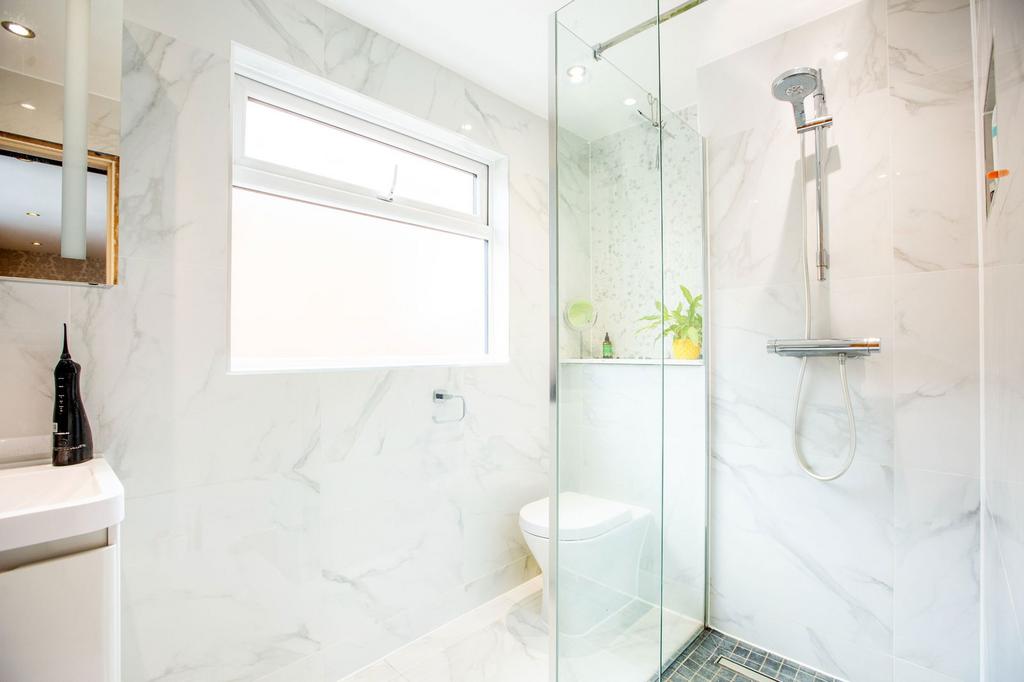 The marble-effect fully tiled walls and floor exude sophistication, complemented by a smooth plastered ceiling with inset spotlights and a chrome heated towel rail. A vanity cupboard with mirrored doors and LED lighting to either side adds style and functionality, while an extractor fan and UPVC double glazed obscured window to the side aspect complete this contemporary space.