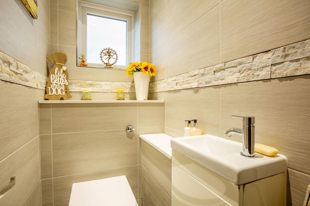 A two-piece modern white suite comprising a low-level WC with concealed cistern and flush mechanism, and a vanity hand wash basin with stainless steel mixer tap and cupboard beneath for convenient storage. The room is finished with tiled walls and flooring, complemented by underfloor heating and a smooth plastered ceiling with inset spotlights. A UPVC double glazed obscured window to the side aspect provides natural light while maintaining privacy.