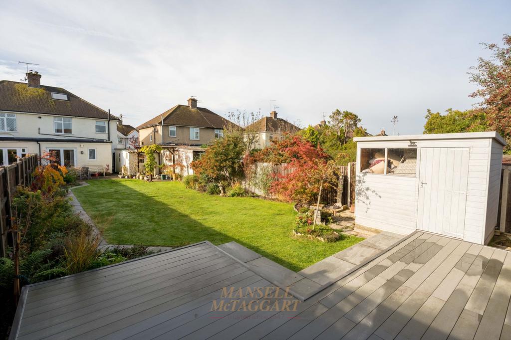 Outside, the private, landscaped rear garden is mainly laid to lawn, bordered by mature shrubs, and includes both decking and patio areas, ideal for outdoor entertaining and relaxation.