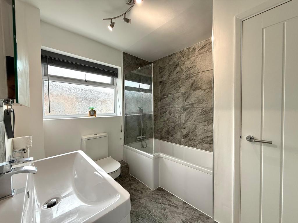 Upstairs, the property offers three comfortable bedrooms and a modern family bathroom with bath, shower over, vanity unit, and WC. The master bedroom benefits from fitted wardrobe space, while the additional bedrooms provide flexibility for guests, children, or a home office.