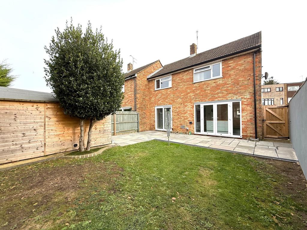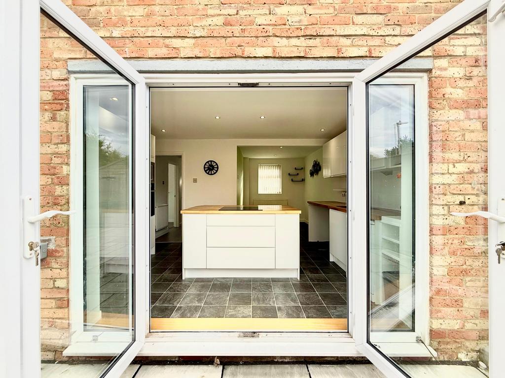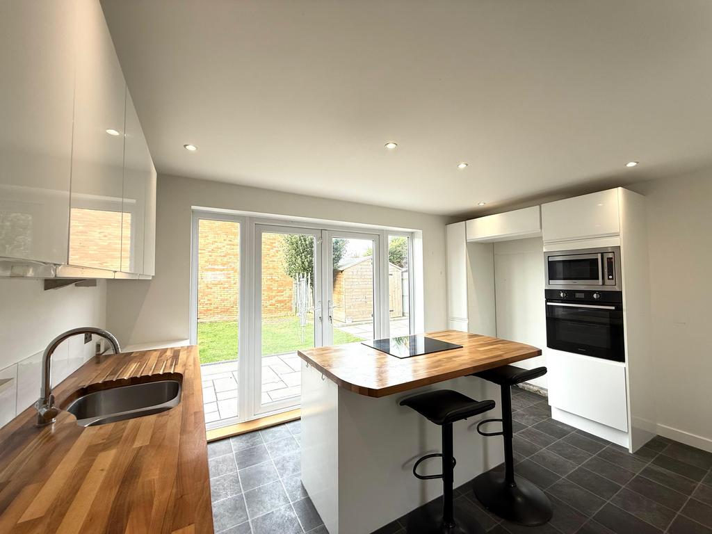 On the ground floor, a welcoming hallway leads to a bright and spacious dual-aspect lounge with glazed sliding doors opening onto the rear garden. The contemporary kitchen and dining area features stylish wall and base units with integrated appliances, a breakfast bar, and French doors leading to the garden, creating an ideal space for family meals and entertaining, with convenient under-stairs storage completing the layout.
