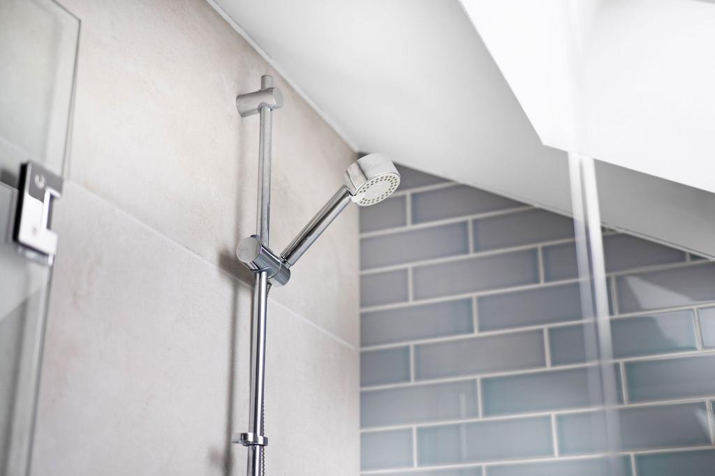 4ft 8 x 7ft 11 a modern white three-piece suite comprising of an enclosed shower with a thermostatic shower on a riser rail, vanity wash hand basin with chrome mixer tap and low-level push flush WC. Double glazed roof window, down lights, extractor fan, chrome heated towel radiator, tiled flooring, and tiled walls.