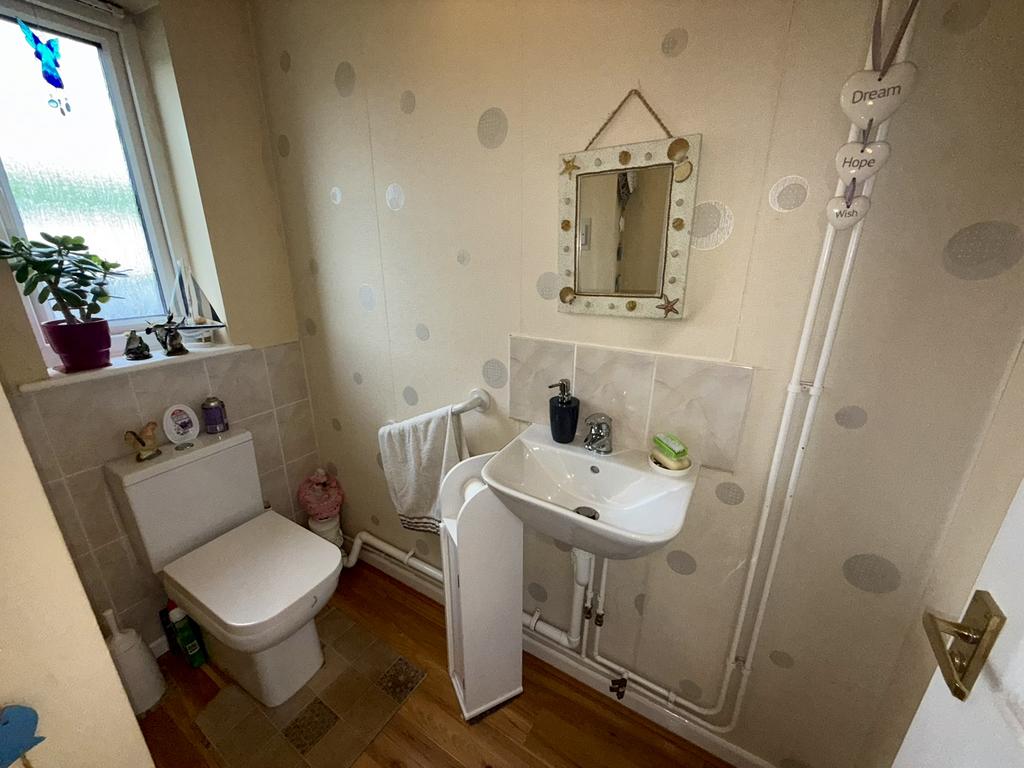 Double glazed window to front, low level flush WC, wash and basin and tiled splashbacks.