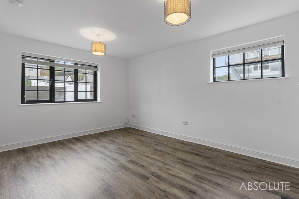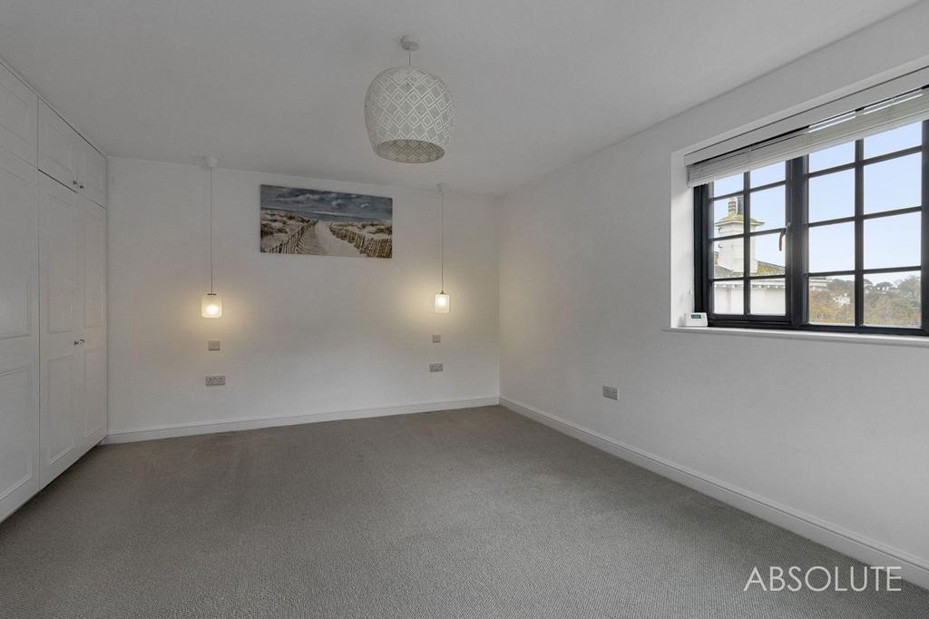 Upstairs, the light and airy landing features a statement pendant and leads to two superb double bedrooms – each with extensive bespoke wardrobes. The principal bedroom enjoys a pleasant open outlook over the gardens and across Torquay, while the luxurious bathroom is fitted with a large bathtub with waterfall tap, walk-in shower with cascade fitting, recessed shelving, bespoke cabinetry, underfloor heating and a copper towel radiator. A loft with telescopic ladder provides useful additional storage.
