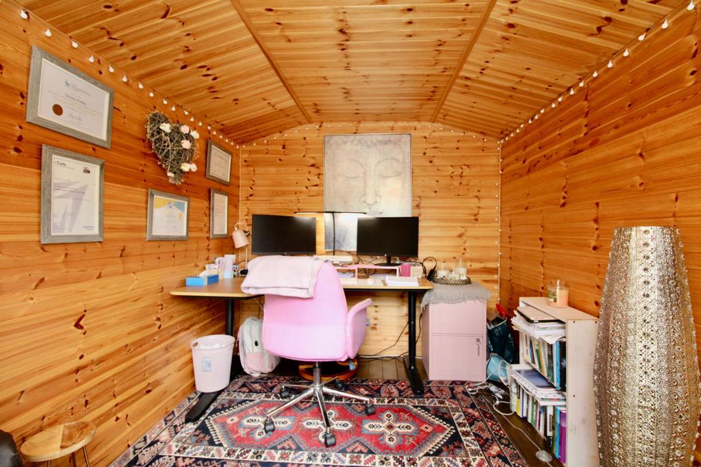 Outside, the property boasts a private rear garden, complete with decking area ideal for entertaining or relaxing in the summer months. A separate outbuilding, currently used as a home office, adds versatility for those working remotely or seeking extra storage space.