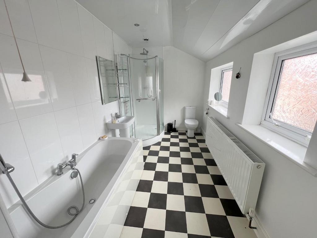 On the first floor there are three bedrooms, two large doubles and a good sized single, and a white suite bathroom with separate shower cubicle.