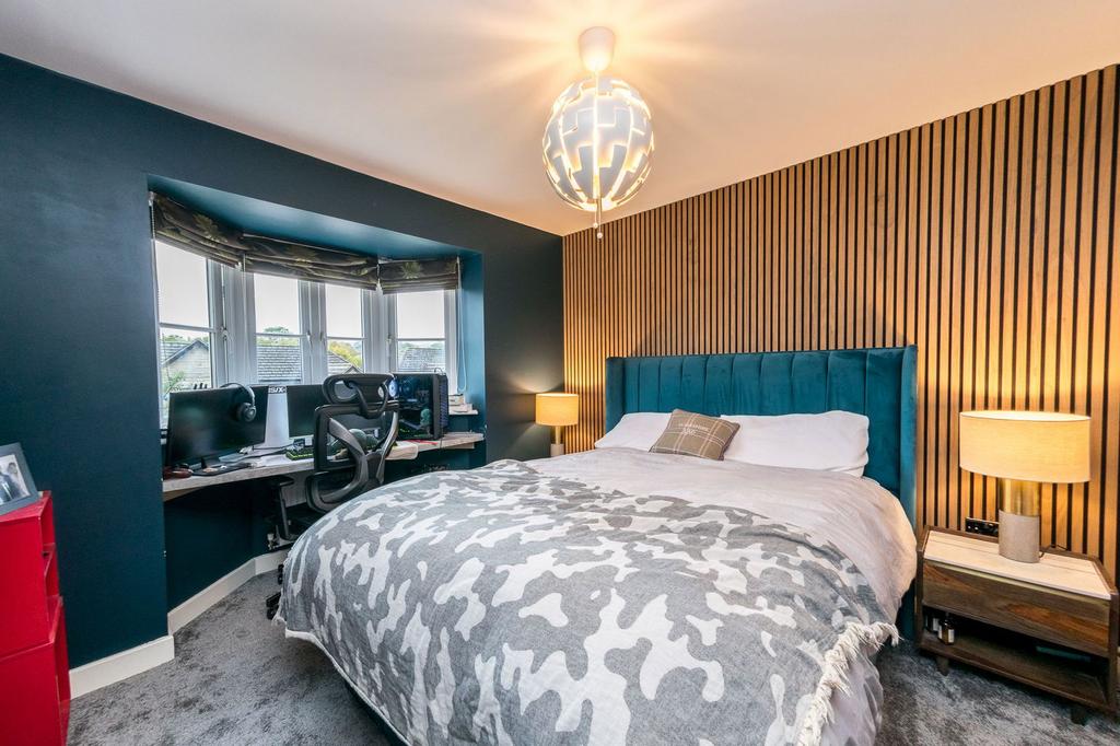 Another spacious double bedroom, bright and airy, with a built-in desk —perfect for gaming or studying. The room overlooks the front of the property, offering a pleasant and welcoming outlook onto the estate.