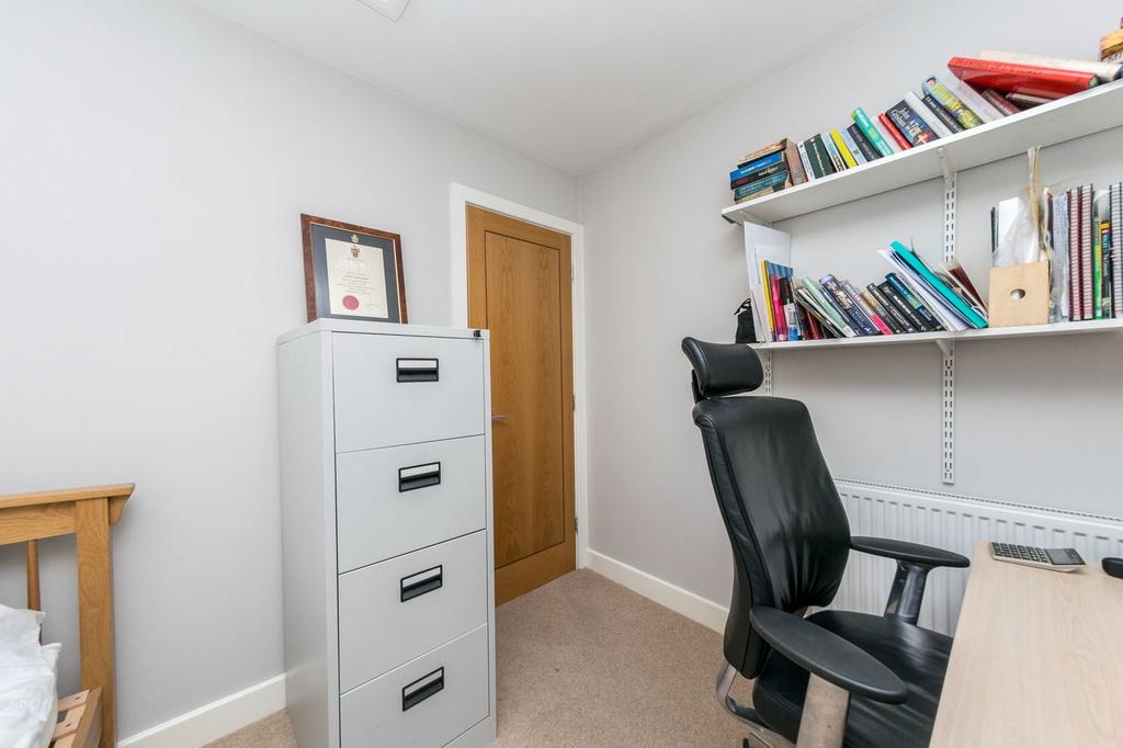 A flexible bedroom that easily fits a bed and also serves as a home office, complete with space for a desk and chair. The room is bright and well-proportioned, making it ideal for multiple uses, offering versatile living.