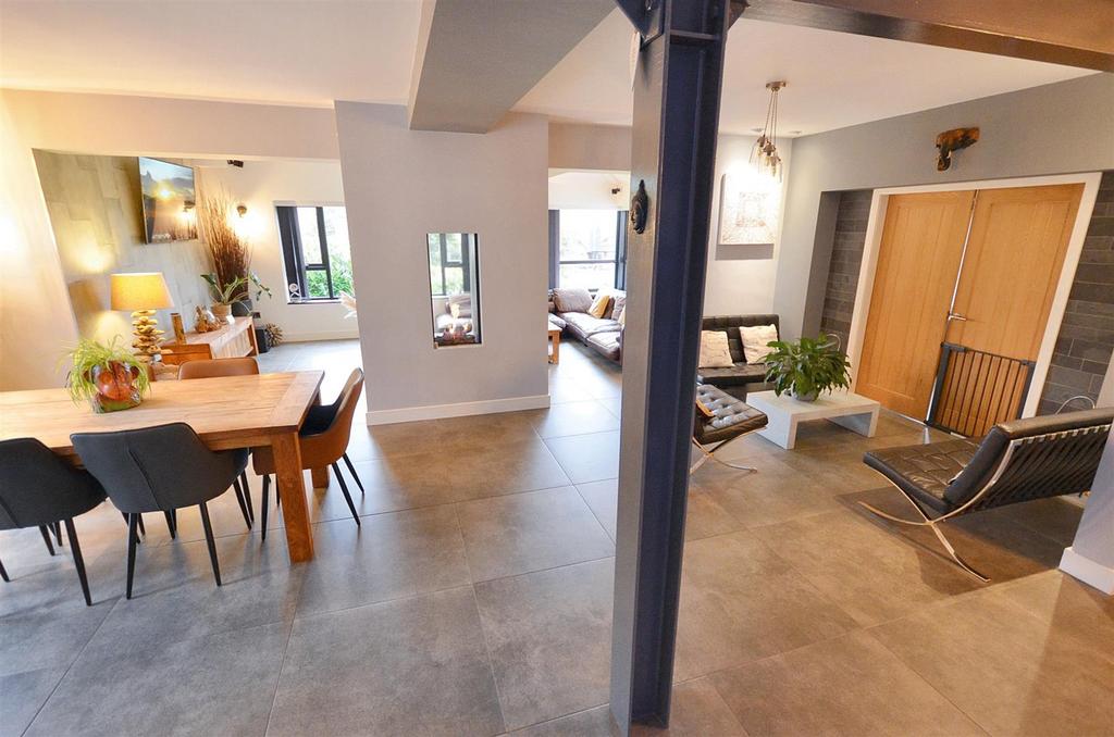 Beyond lies a superb open-plan living space with oodles of room for family and friends to relax or be entertained in style. The layout provides multiple lounging zones, featuring a central chimney breast with living flame fire, dining area with French windows leading out to the gardens. From the sitting area, you can enjoy far-reaching views across Staffordshire, stretching all the way to the Welsh Hills on a clear day. An industrial-style staircase with a glass balustrade rises gracefully to the first-floor accommodation, adding a contemporary design flourish to the space. Double doors lead off the living space to a cosy snug, ideal as a home office, reading nook, or quiet retreat. Under floor heating throughout the ground floor.