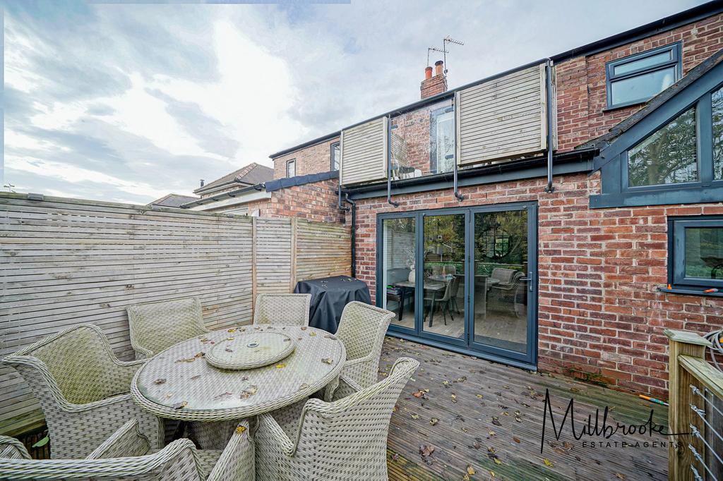 The property comprises an entrance hall with understair storage and a guest w/c. To the front elevation is a cosy main lounge with panelled walls and venetian blinds. To the rear elevation, you will find the impressive kitchen/family room with a second reception area with a log burning stove, a dining area with bi-fold doors opening onto the elevated deck, and a quality, fully fitted kitchen boasting an integrated double oven, induction hob, fridge/freezer, dishwasher and washing machine. On the first floor, you will find the master bedroom located to the rear elevation. Offered complete with the wardrobe, integrated drawers, and a dressing table/mirror. French doors open from the bedroom to a private elevated terrace, perfect for an alfresco breakfast or a glass of wine in the sun. A second double bedroom is located to the front elevation and a third single bedroom or study. A beautifully finished four-piece bathroom suite complete with quality fixtures and fittings. Off the landing is access to the partially boarded loft space, offering potential additional storage. The property is not overlooked from the front or rear elevations, offering additional privacy for residents.