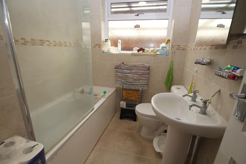 Three piece white suite comprising of panel enclosed bath with independent shower over and shower screen, low level W.C and pedestal wash hand basin, tiled floor, fully tiled walls, heated towel rail, double glazed window to side.