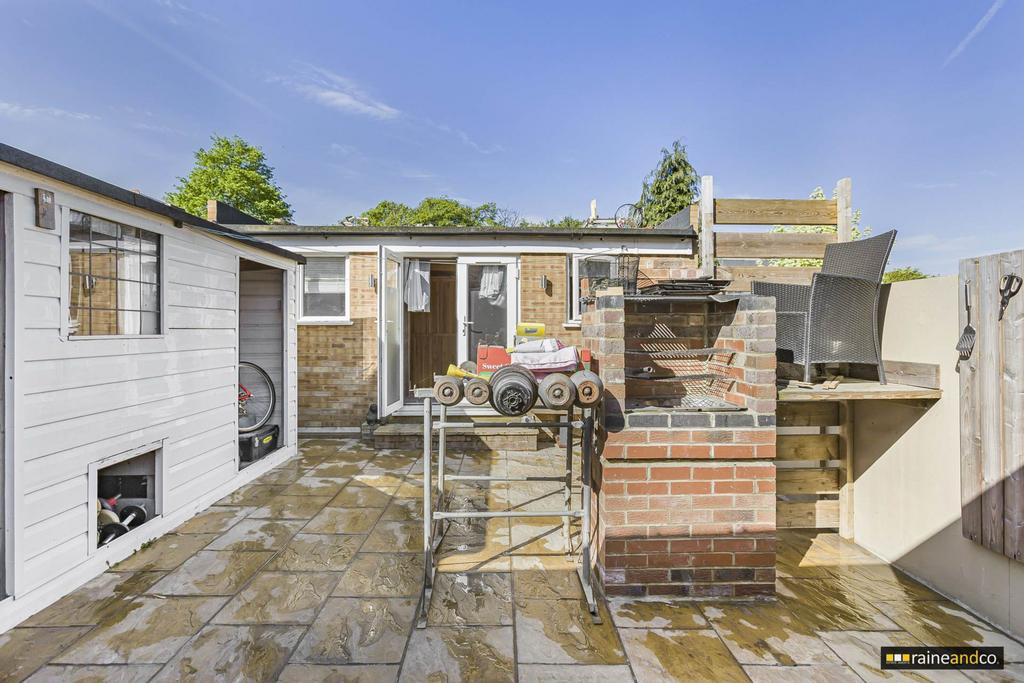 A lovely low maintenance outdoor space with a tiled patio area, perfect for summer dining and entertaining. Includes a brick built barbecue, storage shed, and access to the annex, creating a practical and social garden setting.